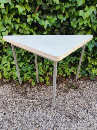 Mesa auxiliar triangular, práctica y fácil de guardar. - Tablero de plástico resistente. - Patas de metal estables.