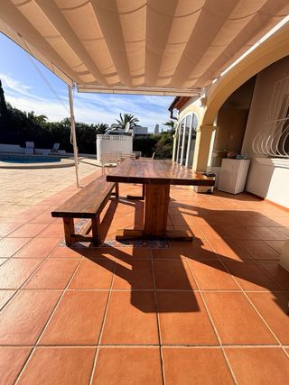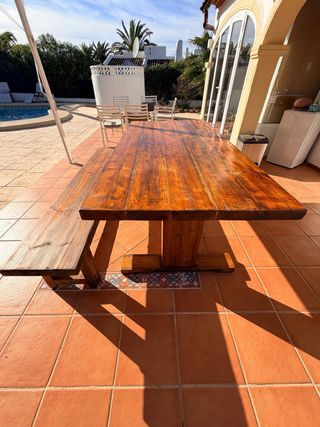 🗣️ RECOGER ANTES DEL MIÉRCOLES EN PINOSOL (Xàbia) **precio negociable en caso de comprar más muebles del perfil** Conjunto de mesa y banco de madera, ideal para espacios exteriores. - Diseño rústico y robusto. - Fácil y cómodo de limpiar. - Acabado brillante en la superficie de la mesa. - Banco a juego con la mesa (se escuchan ofertas)