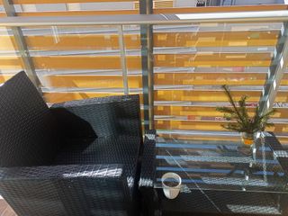 Conjunto de mesa y dos sillas para exterior. Ideales para balcón o terraza. Las sillas son plegables y fáciles de guardar. (Mesa 30cm diámetro, 69cm altura) - La mesa y las sillas tienen un diseño elegante y sofisticado. - Los cojines también incluidos están impecables, muy poco uso. - Perfecto estado de conservación.