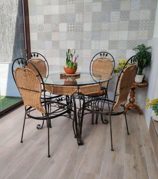 Mesa y sillas Exterior cristal y acero inoxidable.