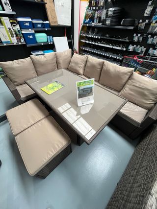 LIQUIDACION Sofa Rinconera + Mesa + 2 puffs de Ratan. Muebles de Jardin y Terraza Sofa Rinconera: 230x175x80 cm. Incluye cojines. 2 Pufs individuales: 40x41x39 cm. Incluyen cojines. Mesa en Ratan sintetico y Cristal Templado: 130x75x69 cm. Perfecta para terrazas y jardines. Montaje facil