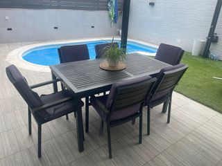 Conjunto de muebles de jardín en madera oscura, compuesto por una mesa rectangular y seis sillas plegables. Ideales para disfrutar del exterior. - Perfecto estado de conservación. - Diseño clásico y elegante. - Listo para usar.