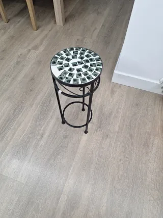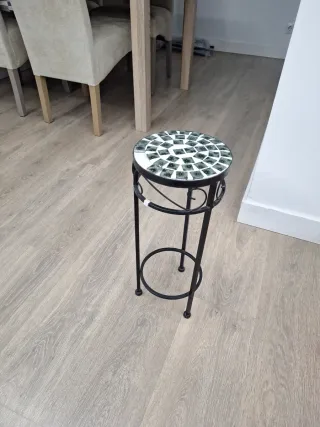 Mesa auxiliar con un diseño decorativo en la parte superior. - Tablero redondo con mosaico de cerámica. - Estructura de hierro forjado. - Patas con base circular.