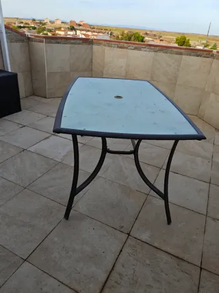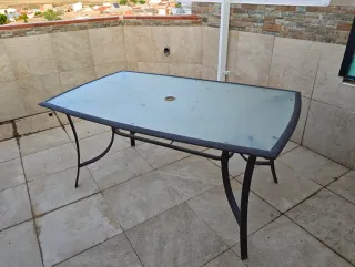 Mesa de exterior con patas metálicas y cristal. El cristal es nuevo, la mesa ha estado en exterior pero tapada con tejado de porche por lo que está en muy buen estado.