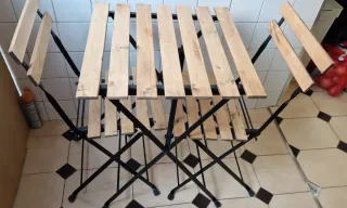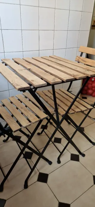 Conjunto de mesa y dos sillas plegables, perfectas para tu terraza o balcón. Fáciles de guardar y transportar. - Tablero de madera. - Estructura metálica negra. -Como nueva.