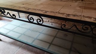 Preciosa mesa de forja con dos niveles. La superficie superior está cubierta con azulejos de cerámica de color beige con detalles decorativos. El nivel inferior es de cristal. Se encuentra en buen estado. Estructura de metal resistente, diseño elegante y funcional. Ideal para jardín o interior. RECOGIDA EN ALQUERÍAS (MURCIA)
