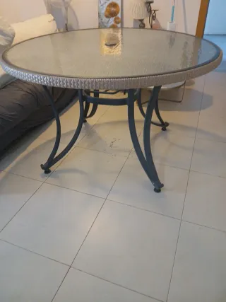 Elegante mesa redonda con sobre de cristal y base de forja. 1,30 de diametro y 75cm desde el suelo - Diseño moderno y resistente. - Ideal para comedor o terraza.