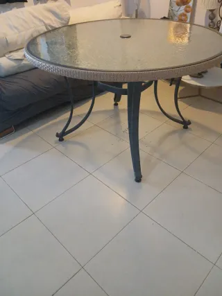 Mesa de terraza con superficie de cristal y estructura de metal. El agujero está en el centro lo que pasa en la foto está en perspectiva - Diseño redondo. - Patas blancas.