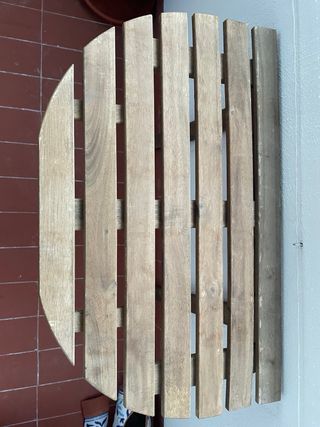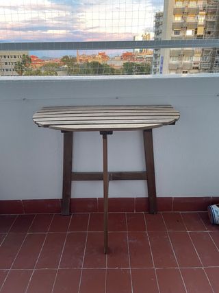 Mesa auxiliar de madera, ideal para balcones o espacios pequeños. Su diseño plegable la hace muy práctica. - Tablero de listones de madera. - Patas de madera resistentes.