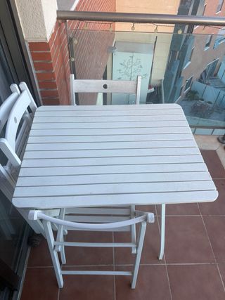 Conjunto de mesa y dos sillas con cojines blanco roto, de exterior modelo TÄRNÖ de Ikea. Ideal para balcones o terrazas pequeñas. - Diseño plegable para fácil almacenamiento. - Estructura metálica resistente. Las medidas de la mesa son: - longitud: 55 cm - ancho: 54 cm - altura: 70 cm Las medidas de las sillas son: 30x40x79