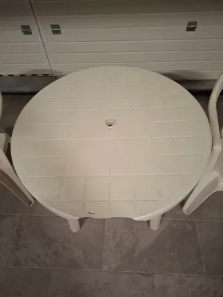 Conjunto de mesa redonda y dos sillas de plástico duro. - Ideal para exteriores o interiores. - Diseño ligero y fácil de mover. Se desmontan las patas de la mesa si quieren.