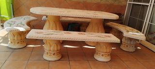 Conjunto de mesa y asientos para exterior. - Mesa con base decorativa. - Asientos con diseño curvo. -2 asientos sin respaldo - 2 bancos con respaldo Perfecto estado Precio original 1100€ No hago envíos