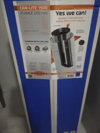 Filtro de olores CAN-LITE 1500 con brida de 200 mm. Diseñado para eliminar olores y mantener un ambiente fresco. - Longitud: 75 cm - Diámetro: 30 cm - Volumen de carbón: 29,43 L - Capacidad técnica: 1650 m³/h - Capacidad práctica: 1500 m³/h - Vida útil del filtro: 18 meses - Humedad óptima: Max 70% - Temperatura óptima: Max 60° C