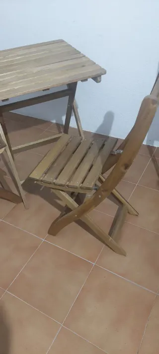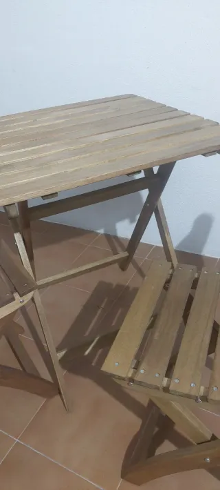 Conjunto de mesa y dos sillas plegables de madera, ideal para terrazas o balcones. Un clásico de Ikea. - Estructura plegable para fácil almacenamiento. - Diseño de listones en la mesa y asientos.