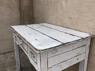 Antigua Mesa Industrial de trabajo auxiliar de cocina, con 3 cajones y pátina artesanal en tonos blancos estilo Shabby Chic. Patas de robusta madera. La madera presenta imperfecciones por el uso industrial y por el paso del tiempo, lo que le confiere carácter. Muy bonita y decorativa es perfecta para tu lugar de trabajo o estudio o para el jardín, o como mesa auxiliar para la cocina. Mejor al natural que en fotos. Medidas del Mueble: fondo 68, alto 80 y largo 100.
