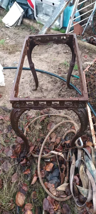 Base de mesa antigua de hierro fundido con patas ornamentadas. Ideal para proyectos de restauración o decoración. - Diseño clásico y robusto. - Patas con detalles tallados.