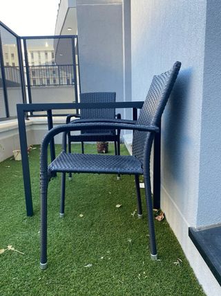 Conjunto de exterior que incluye una mesa y dos sillas plegables. Ideales para balcones o terrazas pequeñas. Son fáciles de guardar. - La mesa tiene tablero de cristal negro. - Las sillas son de tela gris oscuro. - Estructura metálica gris. Con muy, muy poco uso Solo venta en persona Mesa: 70x 70 Alto: 72 cm