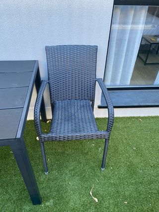 Mesa de jardín con superficie de vidrio oscurecido, en ratán artificai de color negro. Se encuentra en buen estado. - Estructura de ratán trenzado. -reforzada en el centro con barra de aluminio. -Patas deslontables - Superficie de vidrio resistente (algun rallazo casi impercetible por el uso)