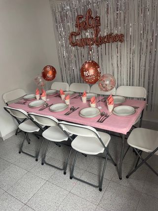- Mesa de resina resistente de 8 puestos - 180cm de largo X 75cm de ancho X 75 cm de alto - Precio sin mantel - Precio por día - Se hace entrega a domicilio Ideal para fiestas, cumpleaños, bazar, catering, ferias, eventos, babyshower, bautizos, compartir, asados, bba, barbacoas, mercadillos, reuniones, asados, mercados, familia, revelaciones, jardin y exteriores.