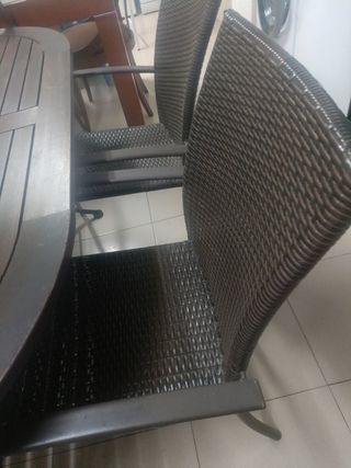 Cuatro sillas de jardín o terraza están fuertes pero necesitan tapizado, como mínimo una de ellas ,las vendería por 20€ cada una. Total sería 80€ las cuatro , podría venderlas por separado dos y dos también tengo la mesa grande de 180 cm con cristal