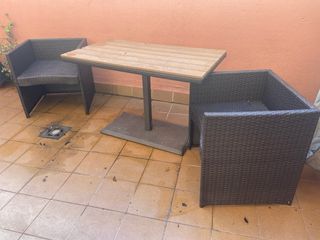 Conjunto de mesa efecto madera (pero de plástico resistente al agua) y dos asientos de ratán que quedan insertados dentro de la mesa, para exterior. Pequeños desperfectos en la mesa. - Diseño moderno y resistente. - Ideal para terrazas o balcones estrechos.