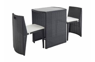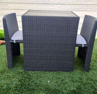 Conjunto de jardín compuesto de mesa empotrada de resina con 2 sillas y estructura metálica. Las sillas encajan entre sí y se guardan debajo de la mesa. La mesa tiene un tablero de cristal templado de 5mm. de grosor. Los cojines son impermeables y se pueden quitar con una cremallera. El conjunto de jardín está hecho con resina sintética muy resistente, diseñado para resistir la luz solar (UV) y las inclemencias del tiempo. Medidas mesa: - Ancho: 50cm - Profundo: 65cm. -Alto: 74cm.
