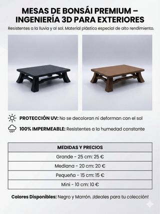 Mesas para bonsái impresas en 3D, ideales para exteriores. Resistentes a la lluvia y al sol, no se decoloran ni deforman. Material plástico especial de alto rendimiento. - Protección UV: No se decoloran ni deforman con el sol. - 100% Impermeable: Resistentes a la humedad constante. - Medidas y precios: - Grande - 25 cm: 25 € - Mediana - 20 cm: 20 € - Pequeña - 15 cm: 15 € - Mini - 10 cm: 10 € - Colores disponibles: Negro y Marrón.