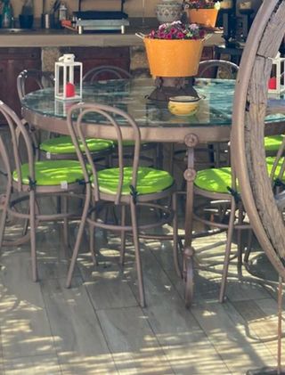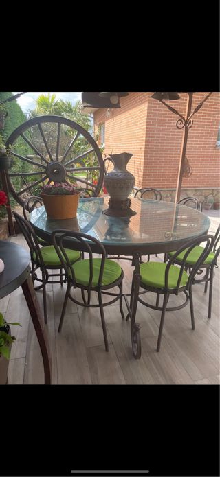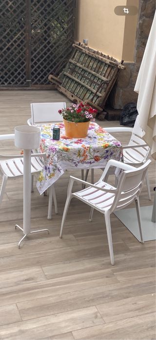 Se vende conjunto de jardín muy cómodo y resistente, ideal para terraza, porche o patio. Está en buen estado y listo para usar. Incluye: 🟦 Mesa de cristal templado con estructura metálica 🪑 6 sillas de textileno ligeras, cómodas y apilables ☂️ Sombrilla beige incluida, encaja en el centro de la mesa Perfecto para comidas al aire libre, reuniones con amigos o relajarte en el jardín. Estado: usado pero bien cuidado, sin óxido, estructura sólida y cristal entero.