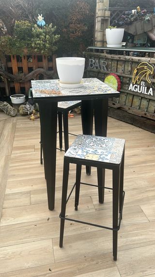 Conjunto de mesa alta y dos taburetes para exterior. La superficie de la mesa y los asientos de los taburetes están decorados con baldosas de estilo hidráulico. - Mesa alta con sobre decorado. - Dos taburetes a juego con asiento decorado.