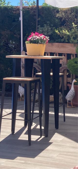 Mesa de terraza con un diseño moderno y elegante. Perfecta para disfrutar de tus espacios exteriores. - Tablero con acabado imitación madera. - Patas metálicas negras.