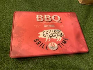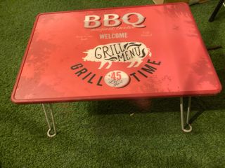 Mesa decorativa con temática BBQ Grill Time. Ideal para exteriores. - Diseño llamativo en color rojo. - Patas plegables para fácil almacenamiento.