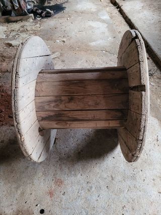 Bobina de cable de madera con detalles metálicos. Diametro 100 cm altura 80 cm, aprox. - Diseño circular con centro hueco. - Ideal para restaurar y hacer una mesa de jardín - Estructura robusta de madera. NO ENVIO - Elementos de sujeción metálicos. - Diseño industrial.