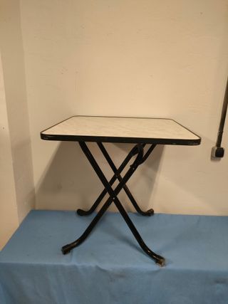 Mesa plegable ideal para camping o cualquier actividad al aire libre. Se encuentra en buen estado. NO REBAJO PRECIO. - Plegable para fácil almacenamiento y transporte. - Superficie blanca lisa. - Estructura de aluminio ligera y resistente. La altura es de 48cm, por lo que no vale para cocinar.