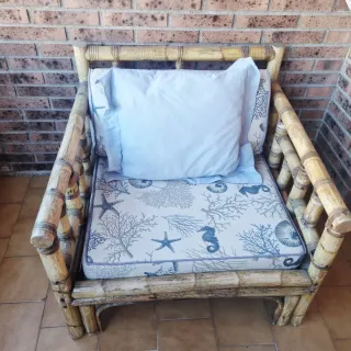 Conjunto mesa y dos sillones bambu en muy buen estado. Medidas: -mesa: 1,12x0,87x0,45. -sillones: 0,80x0,80x0,70 (alto)