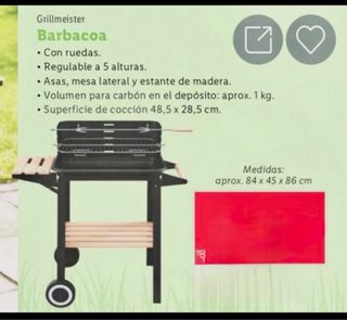 Barbacoa Grillmeister con mesa lateral y estante de madera. - Con ruedas para fácil movilidad. - Regulable a 5 alturas. - Volumen para carbón en el depósito: aprox. 1 kg. - Superficie de cocción: 48,5 x 28,5 cm. - Medidas: aprox. 84 x 45 x 86 cm.