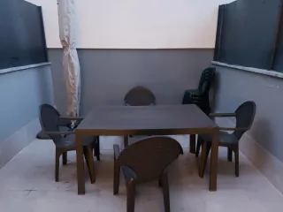 Mesa de terraza de metal recubierto de mimbre plástico gris con 6 sillas 110cm x 170cm. La mesa tiene un cristal negro que se limpia fácilmente. Las sillas se guardan y ocultan debajo de la mesa quedando protegidos los cojines frente a la lluvia. Está usada y tiene los tipicos arañazitos del uso y algún agujero en alguno de los cojines pero el plástico de la mesa y las sillas está en muy buenas condiciones. Muy buena calidad y durabilidad.