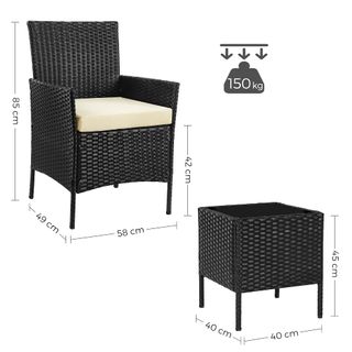 Precioso y cómodo juego de jardín de mimbre sintético, color negro. Incluye una mesa y dos sillones con cojines beige. Ideal para disfrutar del buen tiempo. ✅entregas inmediatas ✅entregas 24h ✅hacemos envios a domicilio ✅transporte y montaje aparte ✅pago contra reembolso ✅tienes un 1 año de garantia ✅mas informacion al WhatsApp 686 128 862 Marta - Estructura de mimbre sintético resistente. - Cojines beige incluidos. - Medidas sillas: 85x58x49 cm. - Medidas mesa: 45x40x40 cm. - Capacidad de peso por silla: 150 kg.
