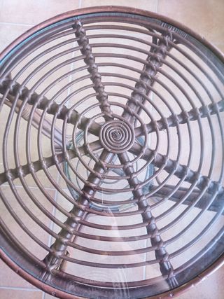 Mesa mimbre con cristal. 75 cm de alto por 60 de diámetro.