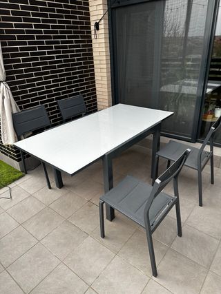 Conjunto de mesa y cuatro sillas para jardín. Ideales para disfrutar del buen tiempo al aire libre. Se encuentran en buen estado. - Mesa rectangular con tablero gris y borde negro. - Cuatro sillas resistentes y cómodas. - Dos de las sillas tienen una pequeña raja como se ve en la foto. - medidas mesa 140x85