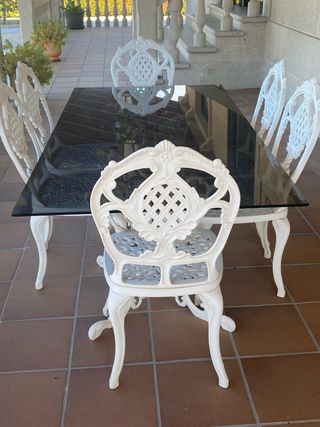 Elegante mesa de jardín con sobre de cristal y estructura de hierro macizo forjado. - Diseño clásico y robusto. - Patas ornamentadas.