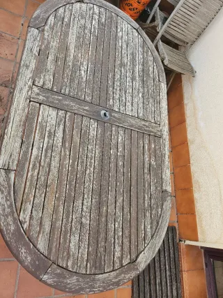 Mesa ovalada de teca, perfecta para tu jardín o terraza. Su diseño plegable la hace fácil de guardar. - Tablero de madera con acabado envejecido. - Muy buen estado - No se hacen envios