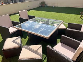 Mesa de jardin con 4 sillas y 4puffs. Tiene partes dañadas, pero se puede usar perfectamente. Negociable