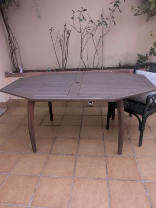 Mesa de teca con un diseño octogonal, perfecta para tu terraza o jardín. Su acabado en madera le da un toque elegante y natural. - Material: Madera de teca. - Color: Marrón.