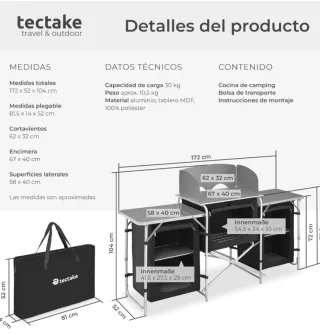 Mesa de cocina plegable de acero inoxidable para camping, ideal para exteriores. Fácil de transportar y montar. Se vende sin estrenar. Tiene una pequeña tara que vimos tarde, por eso no pudimos devolverla (penúltima foto), de ahí el precio, ya que su precio original son 106€. Vendemos porque ya no tenemos tienda. - Medidas totales: 172 x 52 x 104 cm - Medidas plegada: 81,5 x 14 x 52 cm - Capacidad de carga: 30 kg - Peso aproximado: 10,5 kg - Incluye bolsa de transporte e instrucciones de montaje.