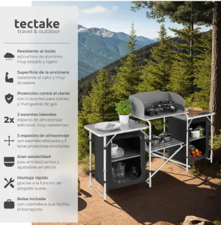 Mesa de cocina plegable, ideal para actividades al aire libre. - Estructura de aluminio. - Con compartimentos de almacenamiento. - Pantalla protectora integrada.
