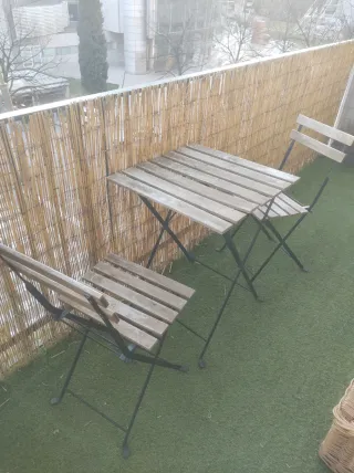 Conjunto de mesa y dos sillas de jardín Tärnö de IKEA. Ideal para espacios exteriores. - Estructura de metal resistente. - Tablero y asientos de madera.