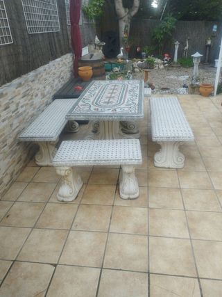 Mesa de jardín de hierro y piedra