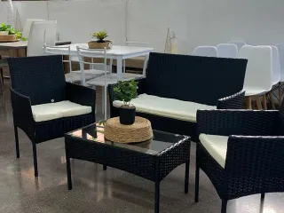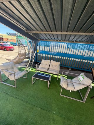 Conjunto de muebles de exterior para terraza o jardín. Incluye dos sillones individuales, un sofá de dos plazas y una mesa de centro. - Diseño moderno y elegante. - Cojines blancos para mayor comodidad. 🏠 Calle Daniel del Olmo 4 polígono Argales Valladolid. RASTRO REMAR.