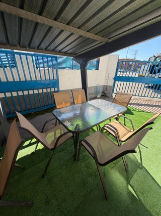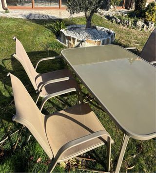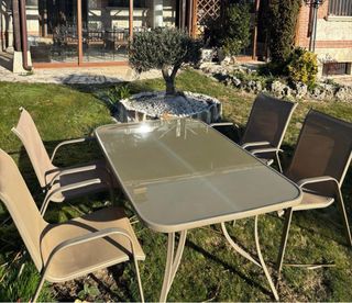 Conjunto de jardín compuesto por mesa de 150 cm x 97 cm de cristal templado y 4 sillas a juego. Estructura metálica resistente y ligera. Ideal para terraza o jardín. Una de las sillas tiene un pequeño agujero en la tela (ver foto), pero no afecta al uso. La vendo por falta de utilizo. Se entrega montada. Recogida en Valladolid.