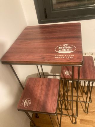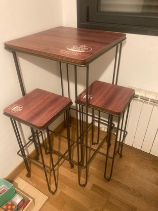 Conjunto de mesa alta y dos taburetes con un diseño moderno. - Mesa con sobre de madera y estructura metálica. - Dos taburetes a juego con asiento de madera y patas metálicas. - Ideal para terrazas o espacios reducidos.